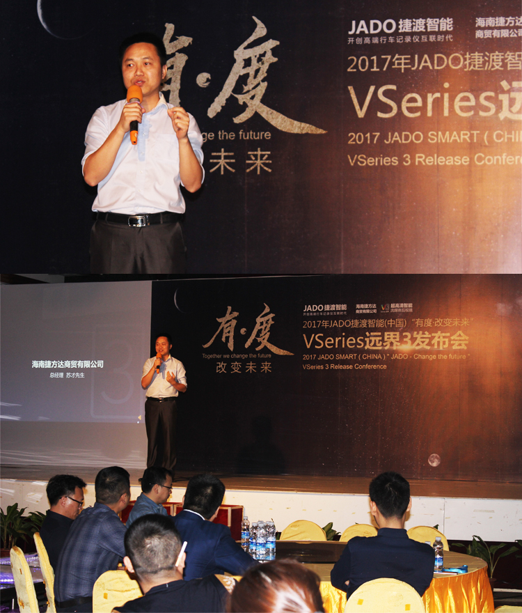 “不忘初心,七年磨一劍!我們迎來(lái)了VSeries遠(yuǎn)界3超高清智能流媒體后視鏡”,JADO捷渡智能(中國(guó))董事長(zhǎng)王杰先生上臺(tái)為大家總結(jié)2017年JADO捷渡智能(中國(guó))所取得的成績(jī),以及2018年JADO捷渡智能(中國(guó))將進(jìn)一步開啟“資本化”和“國(guó)際化”。他表示:非常感謝海南省區(qū)各戰(zhàn)略合作伙伴的蒞臨,期待2018大家攜手共創(chuàng)美好未來(lái)。