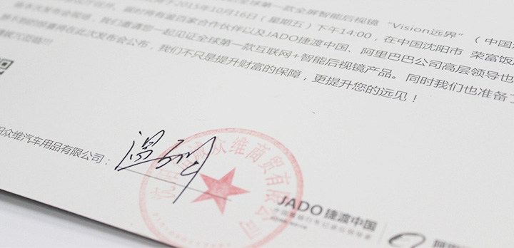 2015年10月16日,以 “改變成就未來” 為主題的“JADO捷渡中國智能后視鏡遠界系列(中國.遼寧)發布會暨戰略合作簽約儀式”,在中國沈陽榮富大酒店完美落幕。